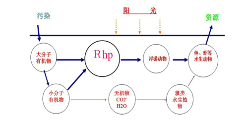 針對目前江河湖泊等開放性水域普遍富營養化和生態系統失衡導致水質污染、藍藻暴發的環境問題,以生物工程技術為基礎,結合包括生態學、藻類學、流體力學、水產養殖學和自動控制學在內的眾多領域的研究成果,以核心技術產品——RhP微生物制劑消耗水體中呈污染態的氮、磷、硫、碳等元素,在不耗氧的條件下完成“腐~生轉化”,為水生動物營造良好的生存環境,為浮游生物特別是浮游動物提供生長繁殖條件,為浮游生物食性的水生動物提供豐富的天然餌料,人類通過對這些水生動物的捕撈,將污染物質成功轉化為可供利用的資源。
