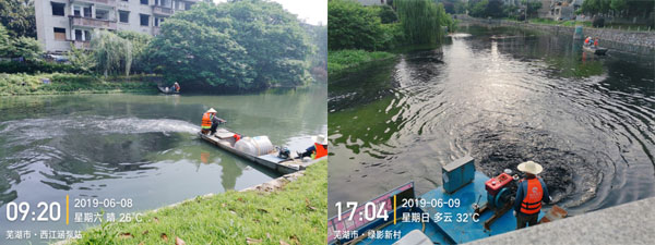 保興垾水域主河道和各支流實施方式和實施劑量均不相同,現場實施時,技術部門依據每日現場巡查結果和水質自檢數據,實時調整實施方式和實施劑量,力求達到最佳治理效果。
