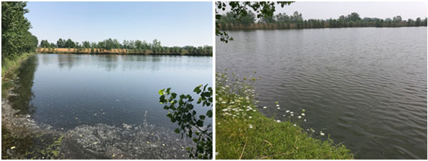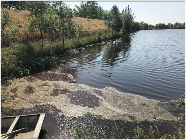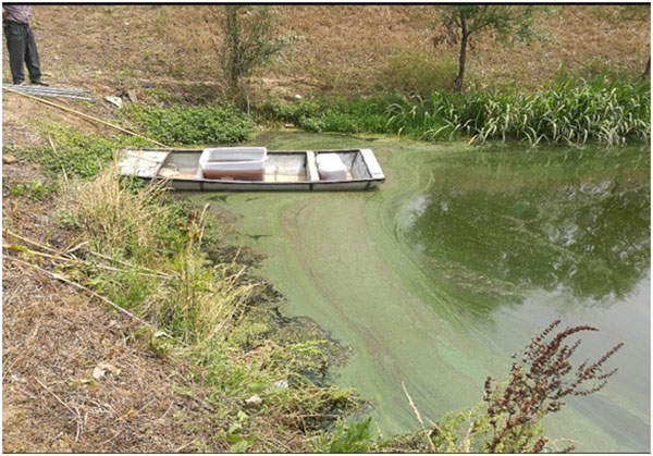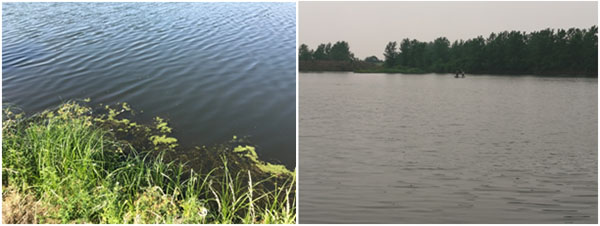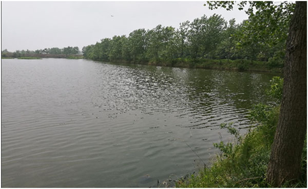 污水塘主要污染為醫藥化學污染,水體發黑,完全沒有透明度,惡臭熏人,長約238米,寬約182米,面積約3.3萬平方米,平均水深未知,據介紹為1米左右,底泥較厚;污水通過西南角污水渠流入水體,污水渠中水色發黑,透明度約15cm;在南側偏東位置有一出水閘門,有水流出直接進入河道;北側偏東位置,有一入水閘門,暫關停。