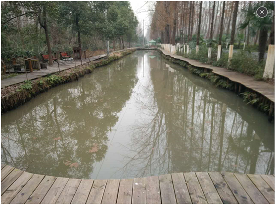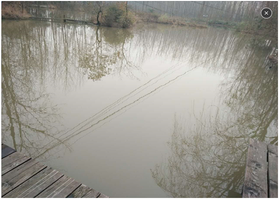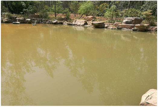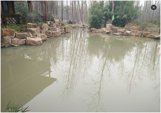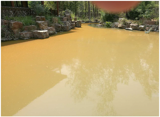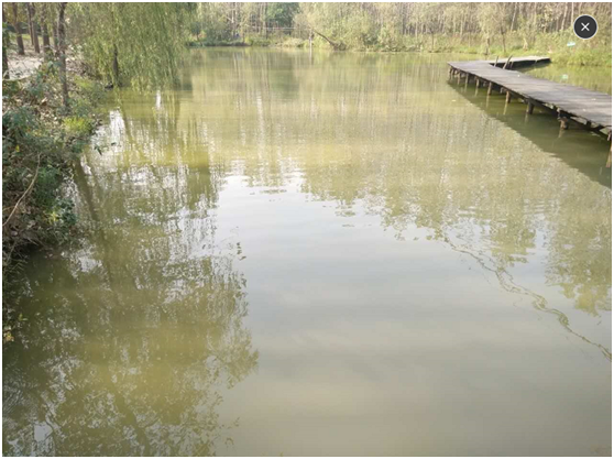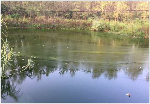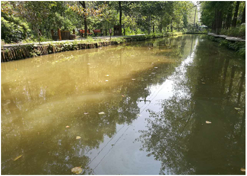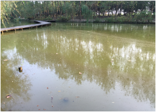 2號(hào)水域:位于茗舍聽(tīng)見(jiàn)附近,水域相對(duì)獨(dú)立,面積0.84畝,水深1.5米,水面飄浮厚厚的藻類(lèi)水華,水生態(tài)嚴(yán)重缺失,水色呈黃色,補(bǔ)水由地下水補(bǔ)充;