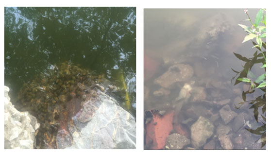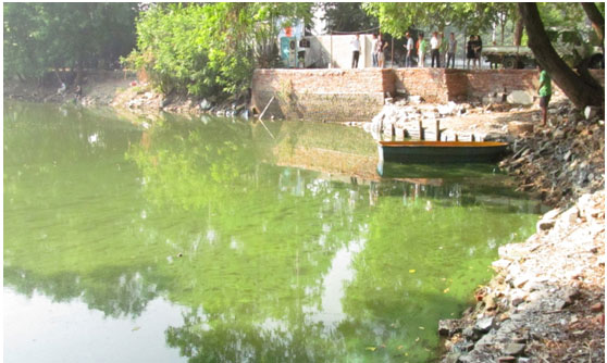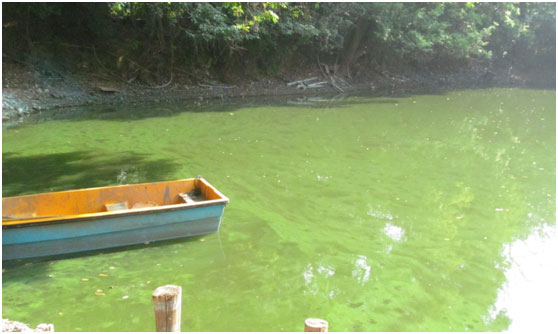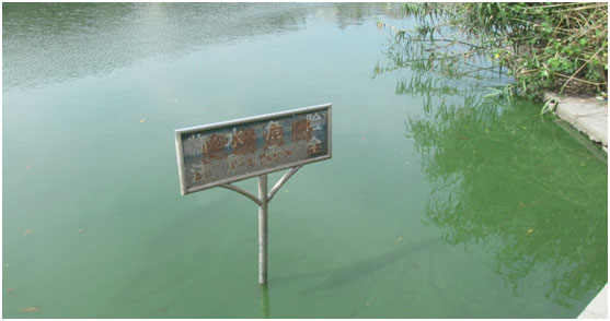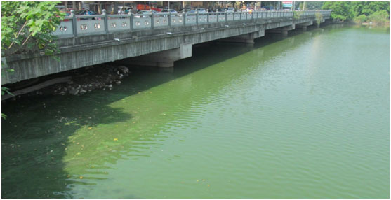 西河入水口,入水中含大量藍藻(水呈綠色)