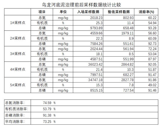 通過以上數(shù)據(jù)顯示,此次治理烏龍河底泥削減治理整體的污染物消除率達(dá)到了73.25%,圓滿完成了合同既定的治理目標(biāo)。